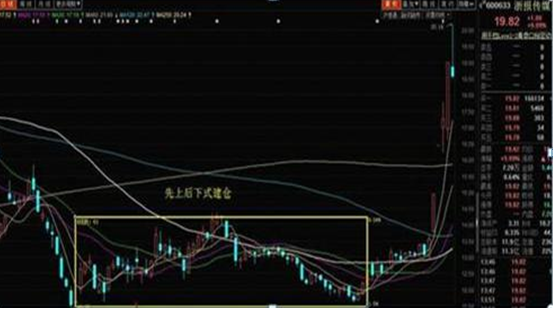 先上后下式建仓是指庄家在股价自然运行到底部区域时漫漫吸纳一部分筹码,在吸筹的过程中并不加以打压或只是稍加打压,因为打压股价也是需要成本的。随着筹码收集的越来越多,股价自然会有一定幅度上涨,而此时庄家并未收集到足够多的筹码,所以还要继续吸筹,这时候由于股价已经有所上涨,前期获利的散户也容易抛出止盈,这时候打压的难度就大大降低,然后庄家就选择在打压之后再收集更便宜的筹码。这种操作在图形上就表现出股价先上后下,所以就称为先上后下式建仓。