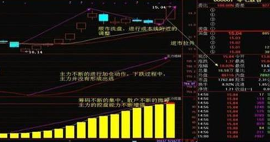 拉高建仓后期总是会有一波下跌,因为庄家还要洗盘,这种图形,跟拉高出货及其相似,这时候前期卖出的散户会觉得自己的操作是正确的。经过一段时间的盘整或下跌,股价开始进入拉升阶段,这个盘整当然就属于洗盘了。